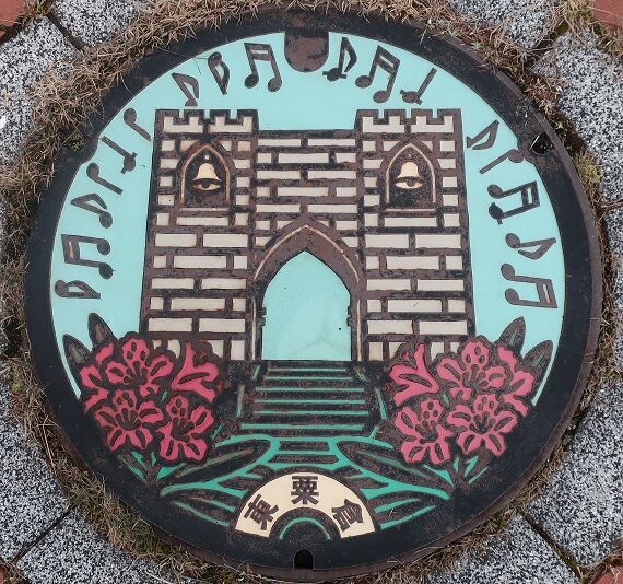 旧東粟倉村の蓋で村の花石楠花と愛の村パークのベルピール自然公園の中に在る日本最大級のスウィングベル「リュバンベールの鐘」と音符がデザインされています。リュバンベールはフランス語で緑のリボンを表すそうで、ベルは自由に鳴らせるそうです。「リュバンベールの鐘」の傍に有りました。