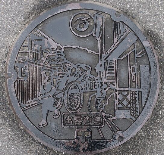市章と出雲街道の風景、人力車がデザインされています。本郷1763の路上に有りました。