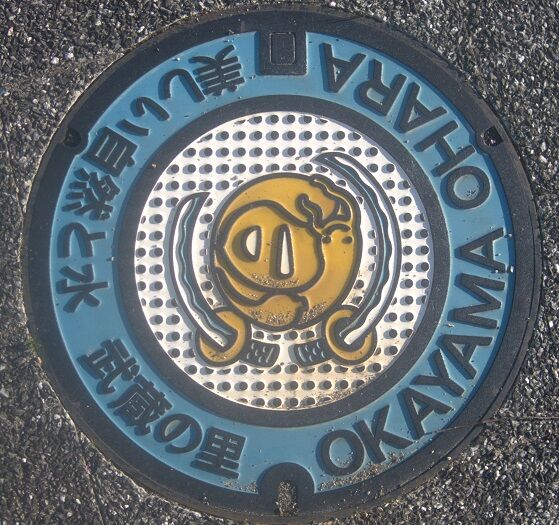 旧大原町の蓋で町章と、宮本武蔵の出身地であることから日本刀と「瓢箪鯰図鐔(ひょうたんなまずずつば)」(武蔵作)がデザインされています。「武蔵武道館」の建物の南側敷地内に有りました。