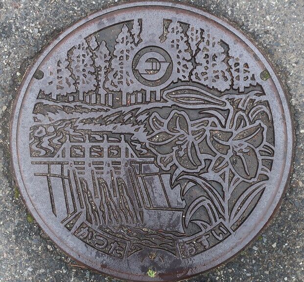 旧勝田町の蓋で町章と町の花百合、町の木杉、梶並川、久賀ダムがデザインされています。馬形47に在る馬形簡易郵便局(休業中)の近くの歩道に有りました。