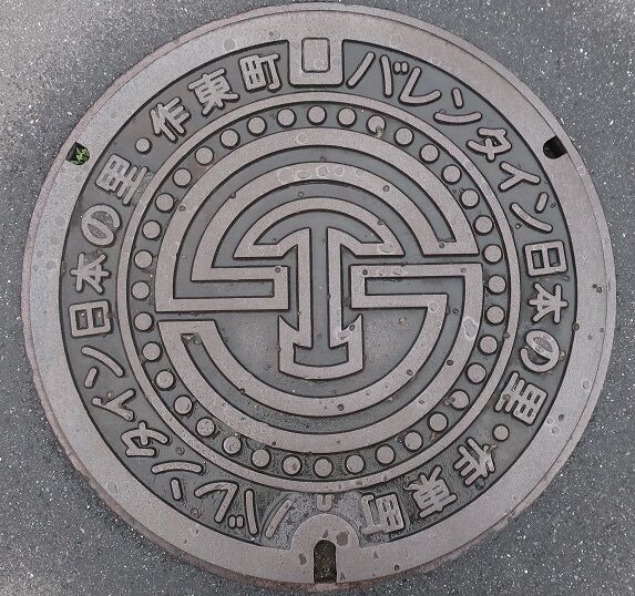 旧作東町の蓋で町章がデザインされています。フランスのバレンタイン市とオーストリアのバレンタイン市、カナダのセント バレンタイン村とで姉妹都市として提携していて、「バレンタイン日本の里」として町興しに取り組んでいたそうです。藤生348に有りました。
