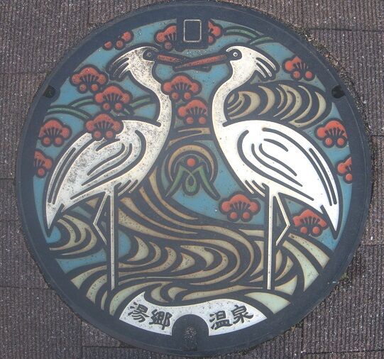 旧美作町の蓋で町章と梅、白鷺がデザインされています。湯郷温泉街入口に在る「からくり時計」の向い側の歩道に有りました。