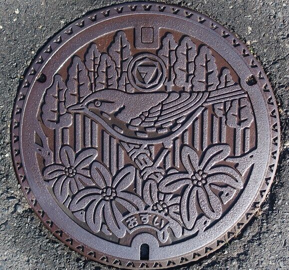 旧阿波村の蓋で村章と村の花コブシ、村の木杉、村の鳥鶯がデザインされています。阿波下沢1-1の路上に有りました。