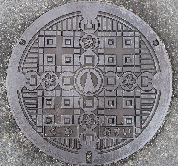 旧久米町の蓋で町章と町の花梅がデザインされています。宮尾1358の路上に有りました。