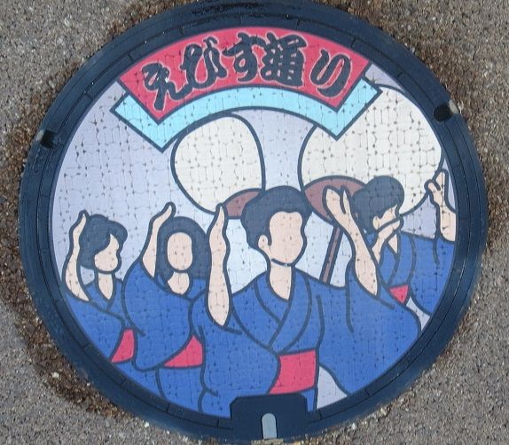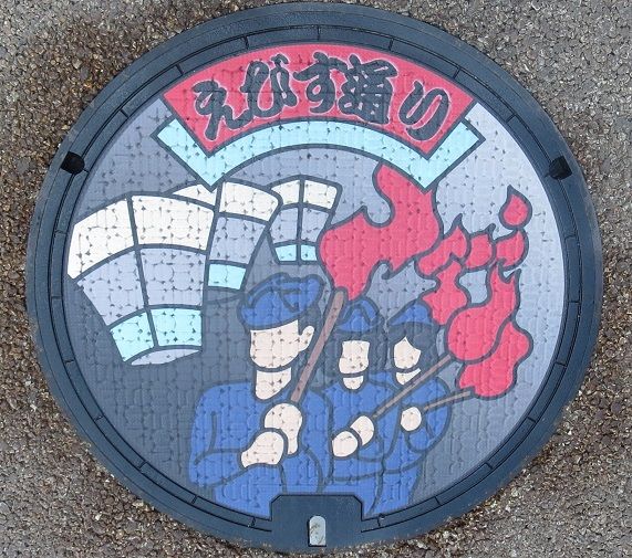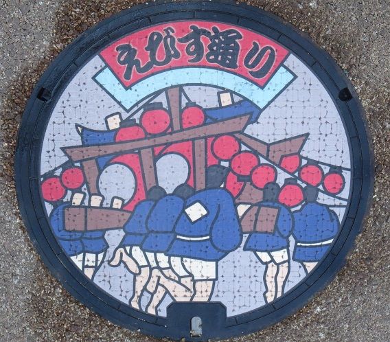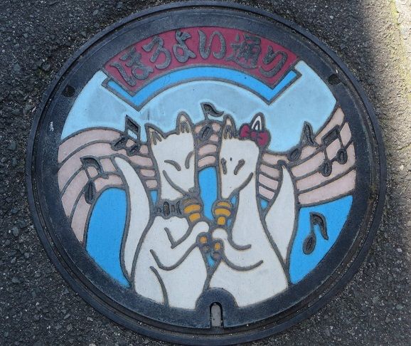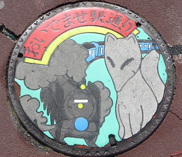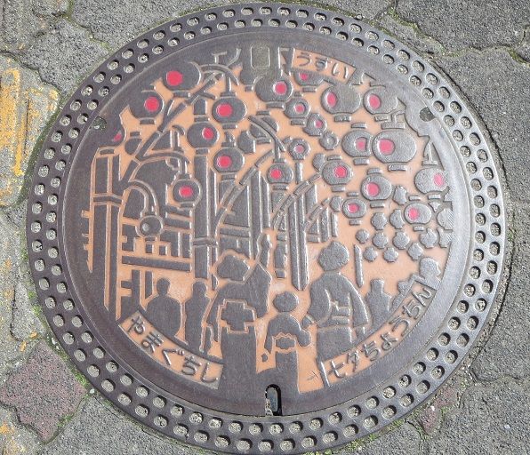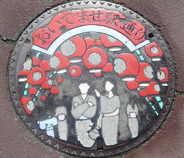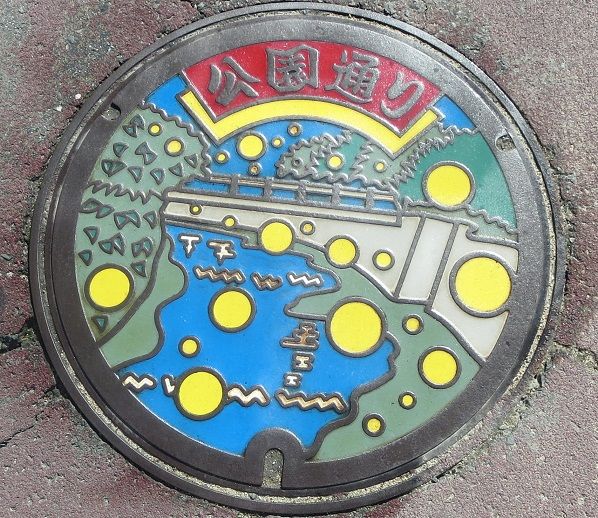 次の9枚の蓋と共に市制施行100周年記念にデザインを募集した小学生の優秀作品の蓋です。設置場所はこちら。