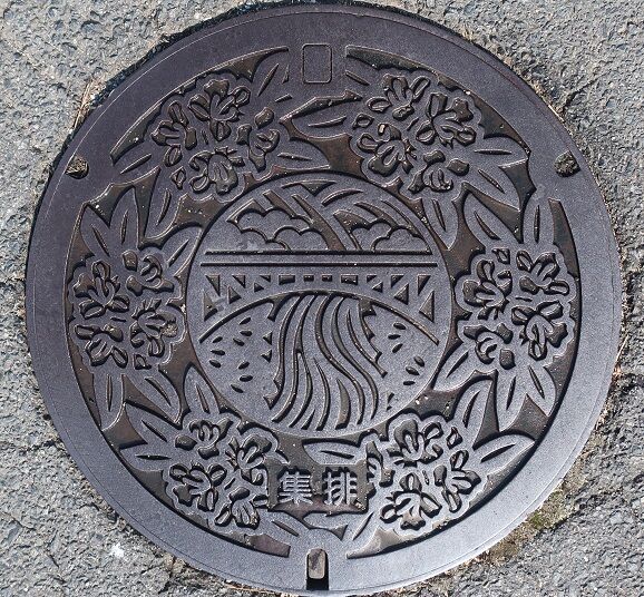 旧山陽町の蓋で町章と町の花躑躅、竹と筍がデザインされています。福田302辺りの路上に有りました。