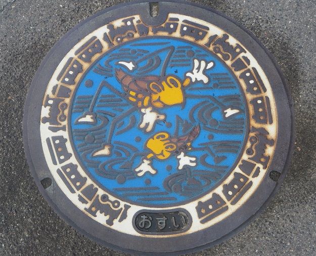 旧小郡町の下水道キャラクター「あめんぼ」の親子と「SLやまぐち号」がデザインされています。新山口駅の近くに有りました。