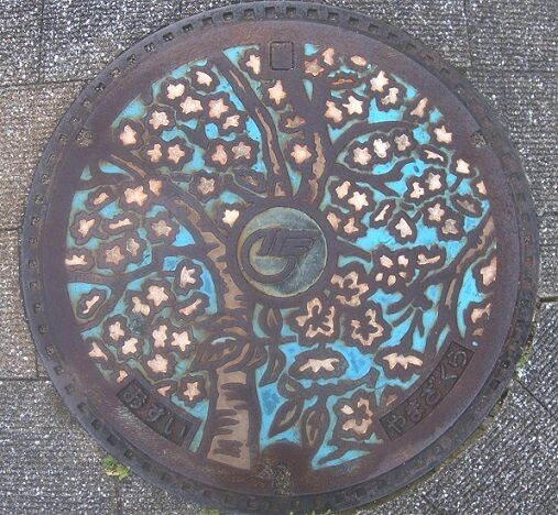旧佐土原町の蓋で町章と町の花山桜がデザインされています。「佐土原みやこタクシー」の前の歩道に有りました。