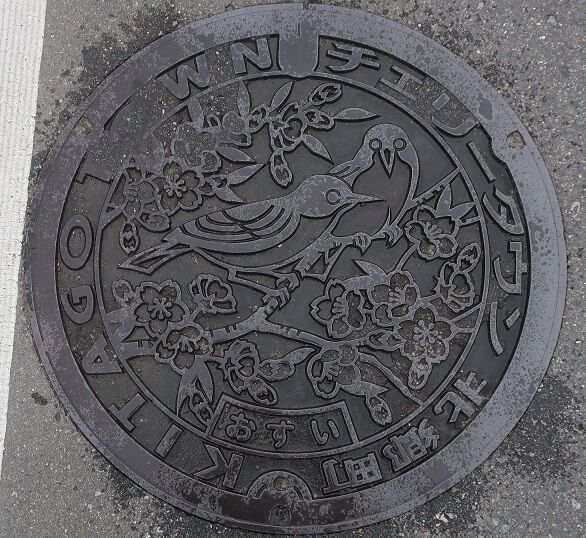 旧田野町の蓋で町章と町の花山茶花、町の鳥メジロがデザインされています。田野町甲5550-4の路上に有りました。