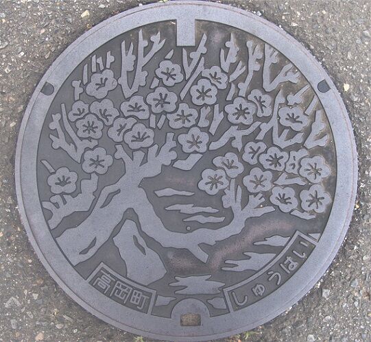 旧高岡町の蓋で町の花梅がデザインされています。高岡公民館の前の路上に有りました。