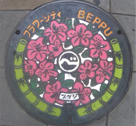 市の花躑躅がデザインされています。元町8-4に在る「別府らーめん やなぎ屋」の傍のアーケード街の歩道に有りました。