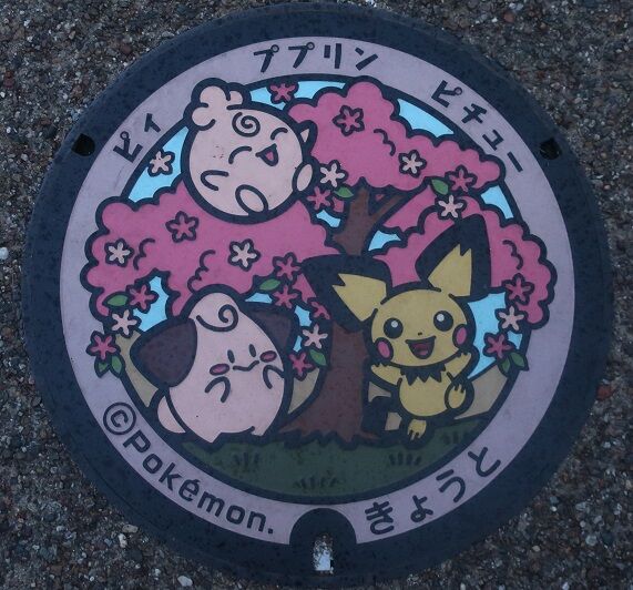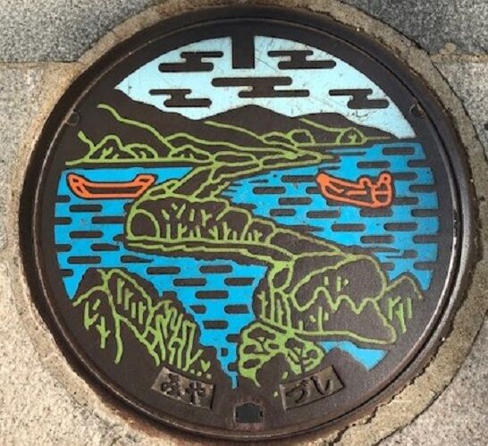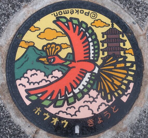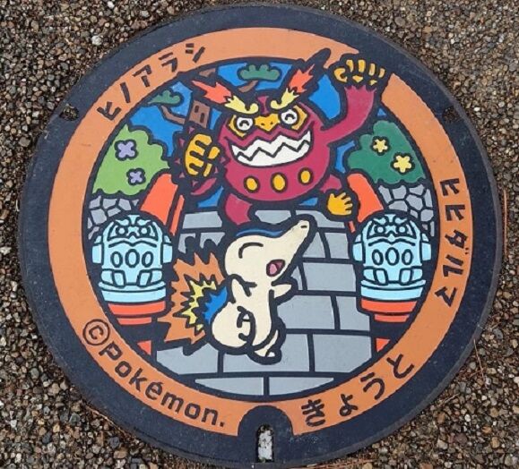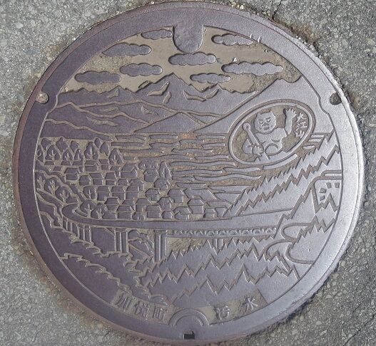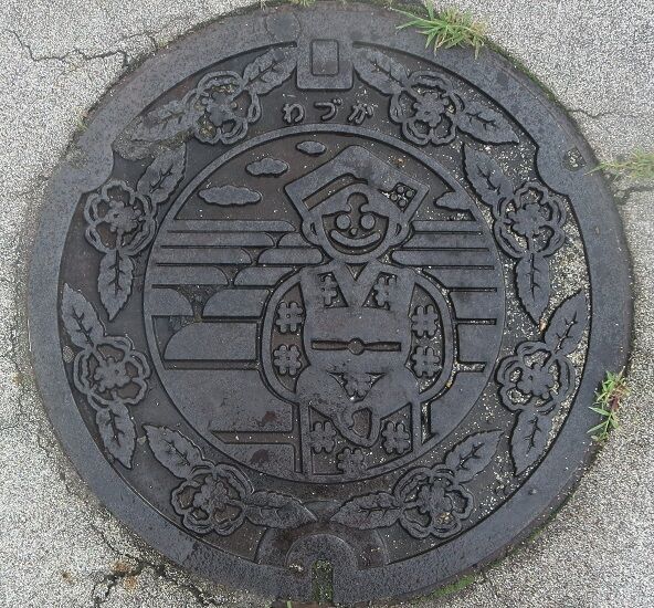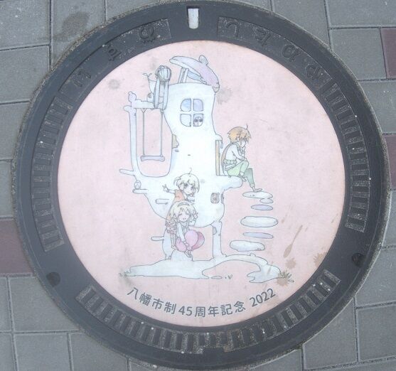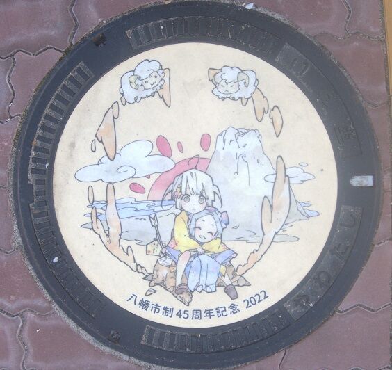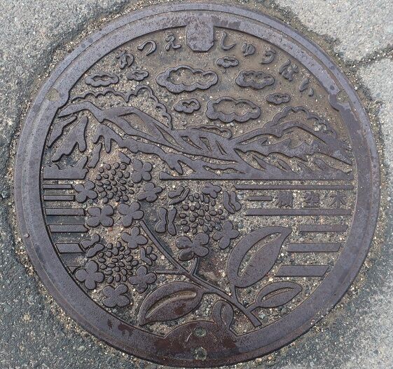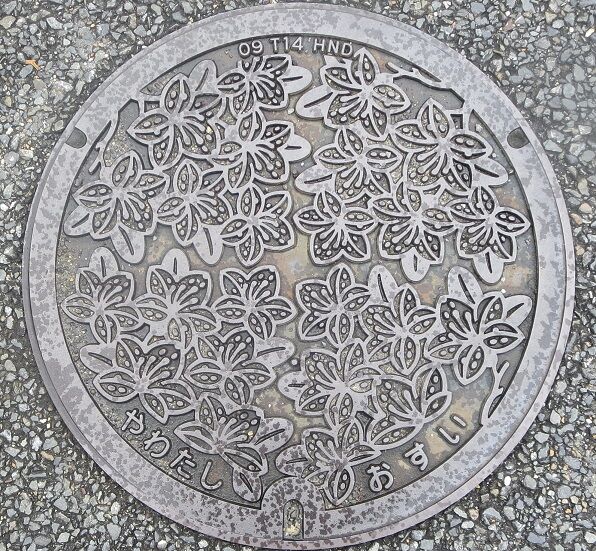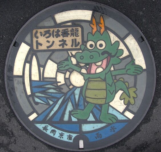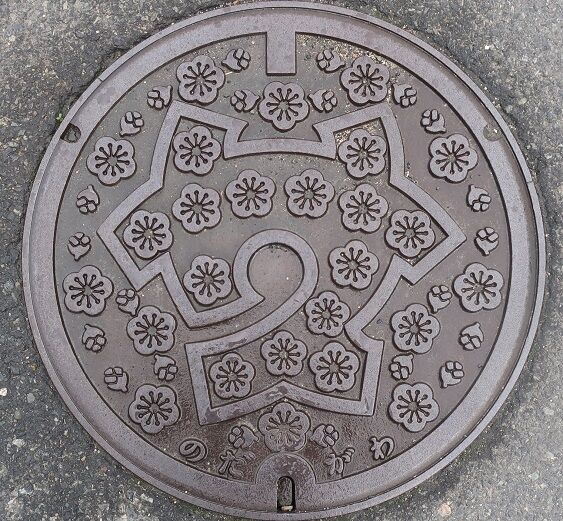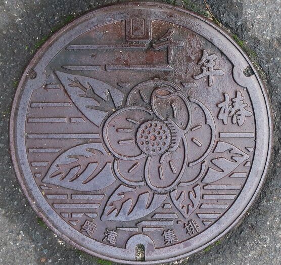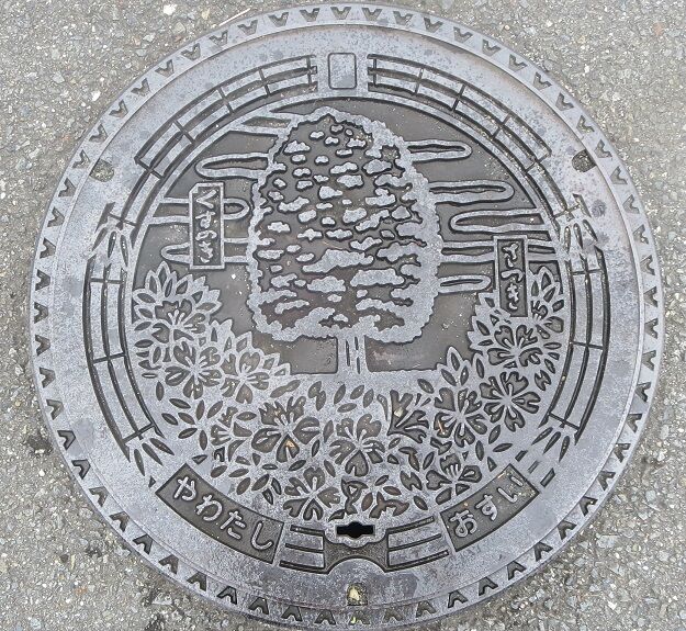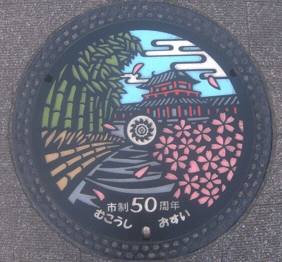 市制施行50周年記念の蓋で、「全国遊歩百選」に認定されている向日丘陵の「竹の径」と桜並木、在りし日の「長岡天満宮」がデザインされています。JR東海道本線向日町駅西口のロータリーの出口の歩道に有りました。