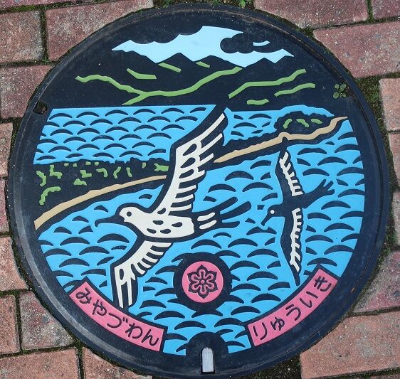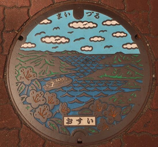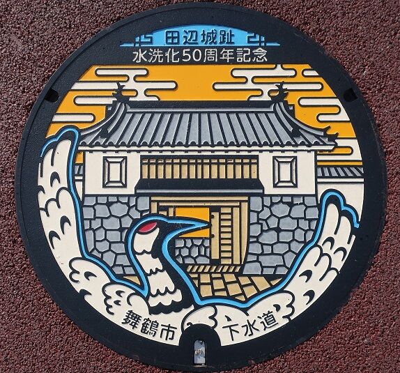 「天橋立」の「飛龍観」がデザインされています。「天橋立」を眺める景色は眺める方向によって、「飛龍館」(「天橋立ビューランド」から)、「昇龍観」(「笠松公園」から)、「一字観」(「大内峠」から)、「雪舟観」(「獅子崎・雪舟観展望所」から)と名付けられていて、これらは「天橋立四大観」と呼ばれるそうです。「松風荘」の前の歩道に有りました。