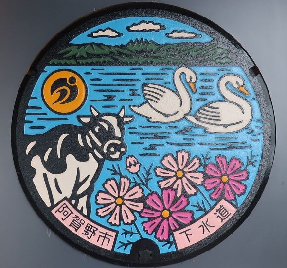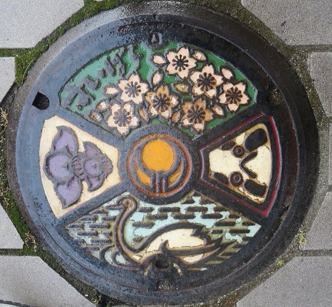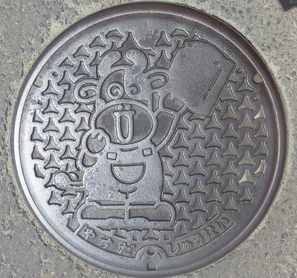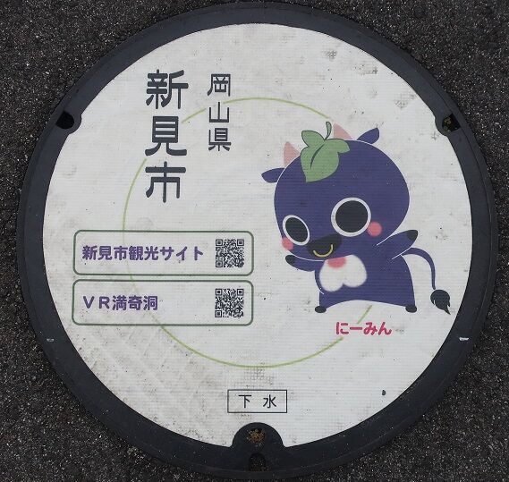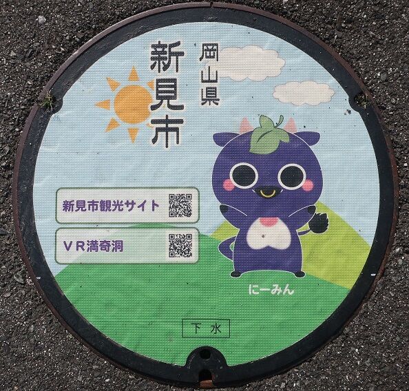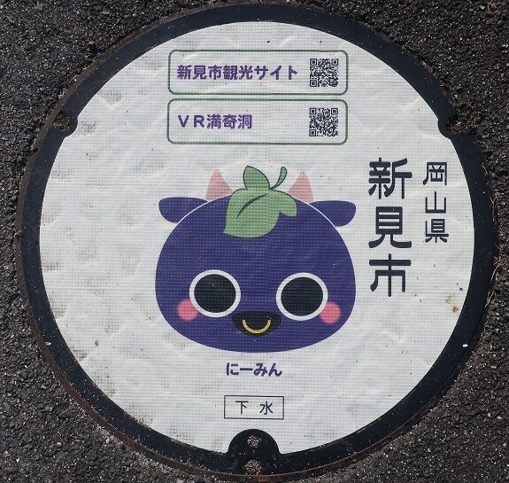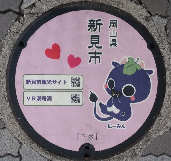 市のマスコットキャラクター「にいみん」がデザインされています。どの蓋が何処かを記録していませんでした。撮影場所は、新見市防災公園内、新見浄化センターの近く、新見美術館前、新見市立中央図書館前、「太池邸」の東側、憩いとふれあいの公園内、JR伯備線新見駅前でした。
