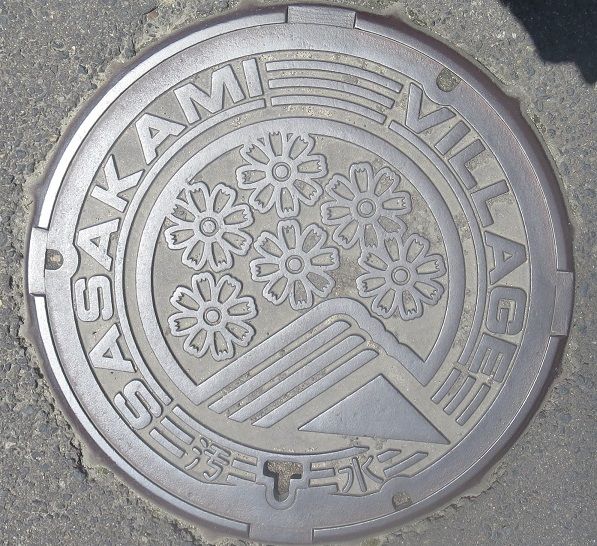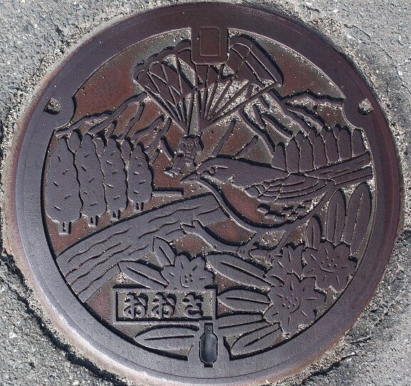 旧大佐町の蓋で町の花石楠花と町の木檜、町の鳥鶯、大佐山で人気のパラグライダーがデザインされています。大佐田治部に在る田治部郵便局の前の路上に有りました。