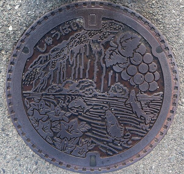 市の花躑躅と特産品の葡萄、滝と鮎がデザインされています。草間8729に在る「そば道場田舎家」の前の路上に有りました。