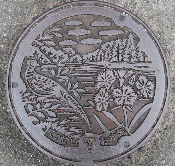 旧哲多町の蓋で町の花鈴蘭と町の木赤松、町の鳥雉、荒戸山がデザインされています。哲多町本郷709の路上に有りました。