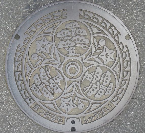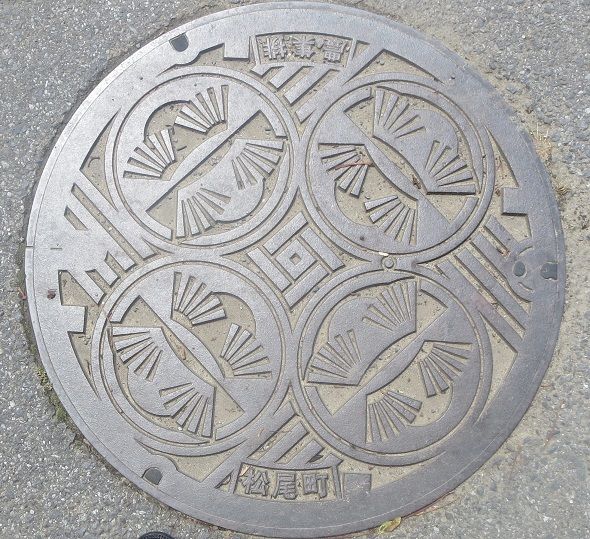 旧稲武町の蓋で町の花躑躅と町の木杉、山と川の風景がデザインされています。市役所稲武庁舎の近くに有りました。