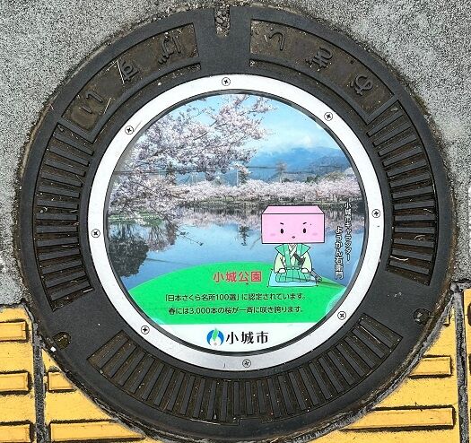 市のマスコットキャラクター「ようかん右衛門」と小城公園の桜がデザインされています。JR唐津線小城駅前の信号交差点の歩道に有りました。