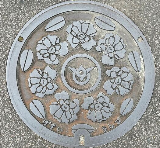 旧牛津町の蓋で町章と町の花山茶花がデザインされています。牛津町牛津604辺りの路上に有りました。
