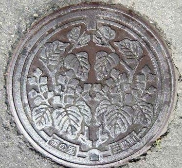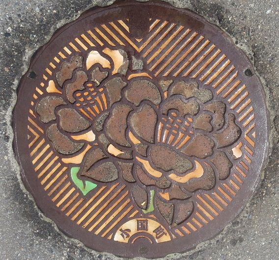 旧小国町の蓋で町の木雪小国(椿の一種)の花がデザインされています。旧上小国小学校沿いの道路の歩道に有りました。