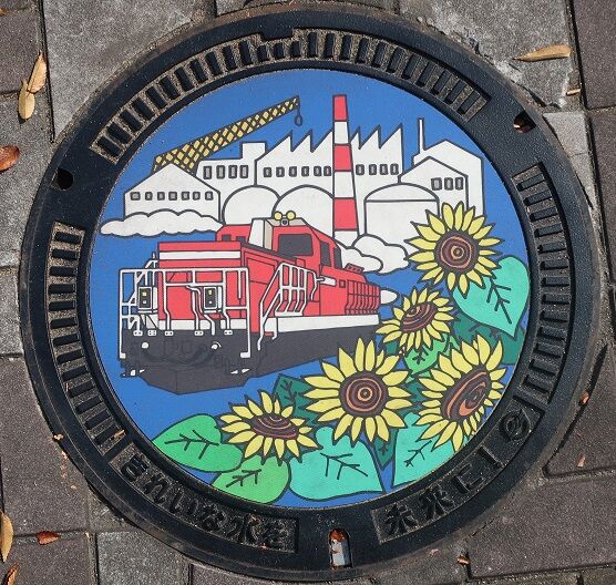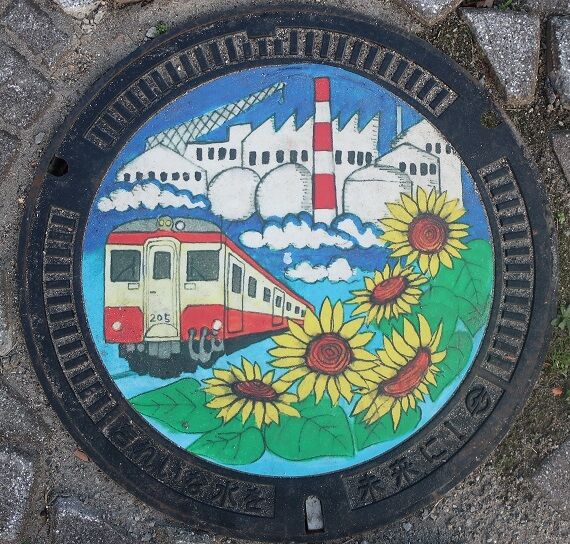次の2枚の蓋と共に水島臨海鉄道の車両がデザインされており、この蓋には水島工業地帯の工場群と「キハ205型」、向日葵がデザインされています。水島臨海鉄道倉敷市駅の出入口の近くの路上に有りました。