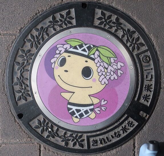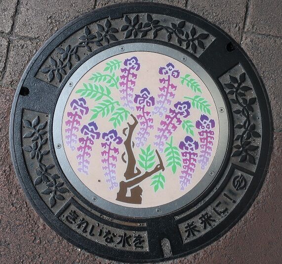 市の花藤がデザインされています。綿花の蓋と共に鶴形2-5の「阿知神社」西参道の傍のえびす通商店街入口の路上に有りました。