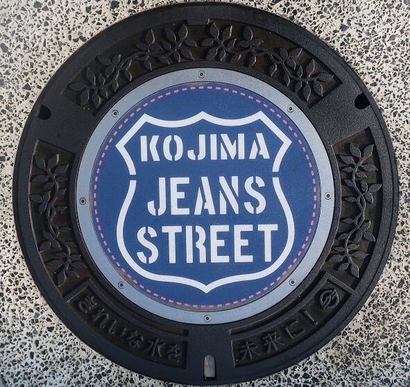 児島ジーンズストリートのシンボルマークがデザインされています。ストリートに在るポケットパークの近くの路上に有りました。