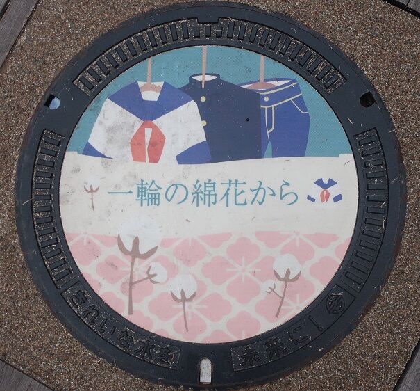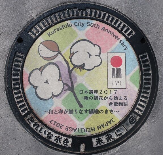 干拓地に植えられた綿花と市の繊維産業の代表の学生服がデザインされています。『一輪の綿花から始まる倉敷物語~和と洋が織りなす繊維の町~』をイメージ。次の2枚の蓋と共に「あちてらす倉敷」の道路側の歩道に有りました。