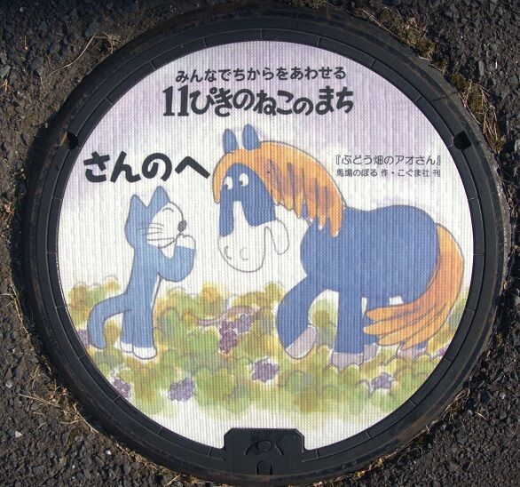 町出身の漫画家 馬場のぼるの絵本作品「11ぴきのねこ」の一場面がデザインされています。二日町23に在る二日町ポケットパークに有りました。