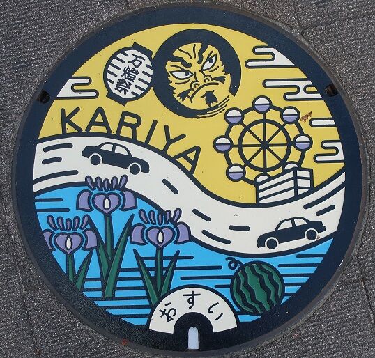 刈谷市のマンホールの蓋 2019年10月06日 今回は刈谷市の蓋を紹介します。市の花カキツバタがデザインされています。今川町2に有りました。カキツバタの右に「エ」の模様が有りますが何でしょうか?市の花カキツバタと特産品の西瓜、「万燈祭(まんどさい)」の張子人形の顔、新東名高速道路、刈谷ハイウェイオアシスがデザインされています。「万燈祭」の「万燈」は高さ5m、重さ60kgの竹と和紙で作られた張子人形です。名古屋鉄道三河線刈谷駅南口に在る「ファミリーマート刈谷駅南口店」の前の歩道に有りました。続きます。 タグ :##刈谷市のマンホール##愛知県のマンホール