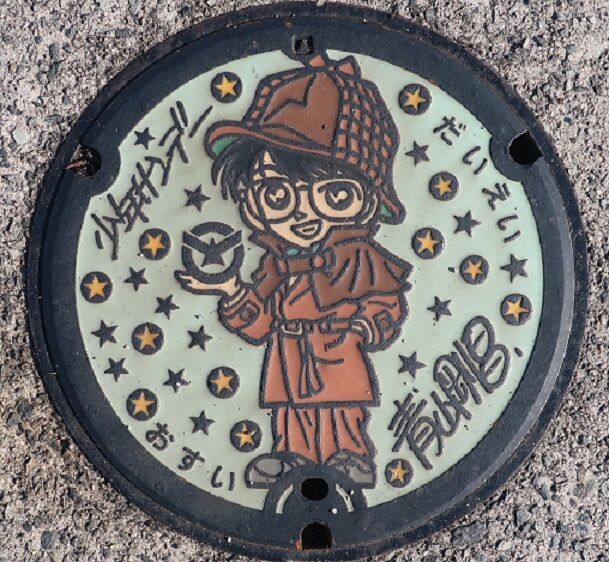 漫画「名探偵コナン」の作者 青山剛昌の出身地で「名探偵コナン」の登場人物がデザインされています。由良宿に在る「喫茶アポロ」の向い側の路上に有りました。