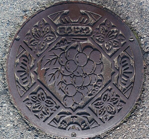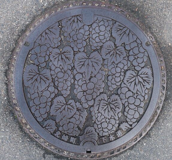 次の2枚の蓋と共に旧北条町の蓋で、町の花皐月と町の木黒松、特産品の葡萄がデザインされています。北条島559に有りました。