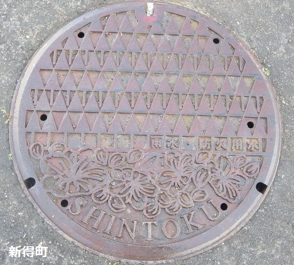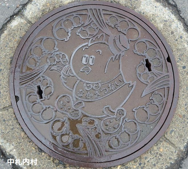 合併後の新しい蓋でアカゲラとナウマン象、合併年がデザインされています。札内桂町の新興住宅地に有りました。