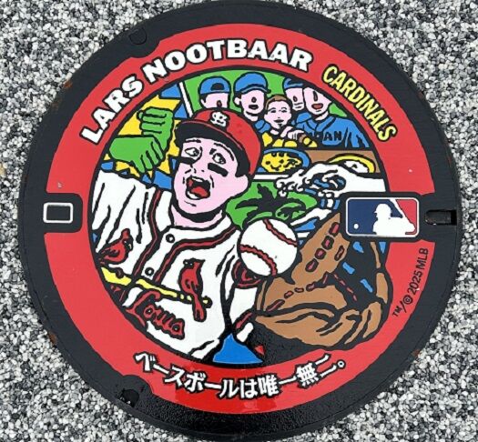 東松山市のマンホールの蓋 2025年08月14日 今回は埼玉県東松山市の蓋を紹介します。MLBの蓋で「セントルイス・カージナルス}のラーズ・ヌートバー選手がデザインされています。母親が当市の出身だそうです。箭弓(せんきゅう)町に在る「箭弓稲荷神社」の鳥居の傍に有りました。続きます。 タグ :##東松山市のマンホール##埼玉県のマンホール##MLBのマンホール##ラーズ・ヌートバーのマンホール