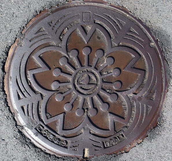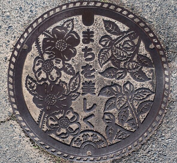 旧細入村の蓋で村章と村の花菊、村の花木山茶花がデザインされています。細入郵便局の前の路上に有りました。