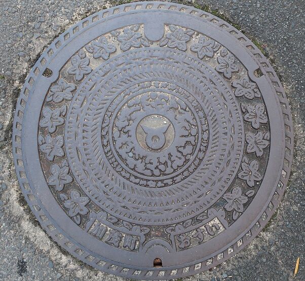 次の3枚の蓋と共に旧木次町の蓋で桜とヤマタノオロチ、尾原ダムがデザインされています。木次町平田に在る温泉郵便局の近くの信号交差点の歩道に有りました。
