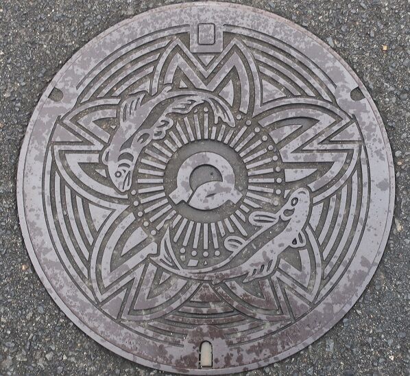 田原本町と天川村のマンホールの蓋 2021年04月10日 今回は田原本町と天川村の蓋を紹介します。先ず田原本町の蓋です。町章と弥生時代の楼閣がデザインされています。町の北部に「唐古・鍵(からこ・かぎ)遺跡」が在ります。次に天川村の蓋です。村の花オオヤマレンゲと紅葉、かりがね橋、アマゴがデザインされています。奈良県流域下水道センターに展示設置してありました。続きます。 タグ :##田原本町のマンホール##天川村のマンホール##奈良県のマンホール