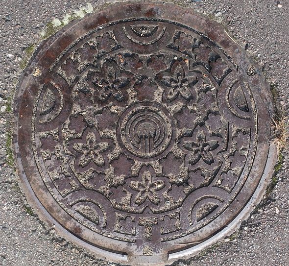 旧福岡町の蓋で町のシンボルマークと町の木桜の花、鯉がデザインされています。福岡町大滝1000に有りました。