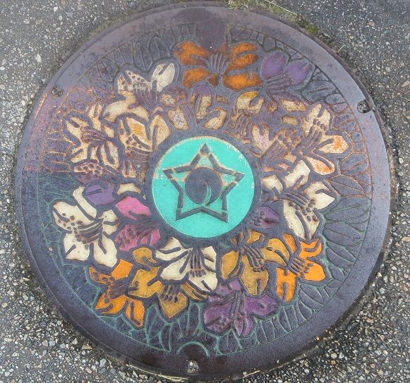 旧福野町の蓋で町章と躑躅がデザインされています。やかた101辺りの路上に有りました。