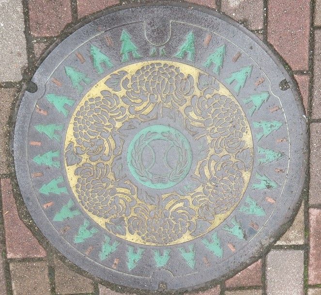 旧細入村の蓋で村章と村の花菊、村の花木山茶花がデザインされています。細入郵便局の前の路上に有りました。
