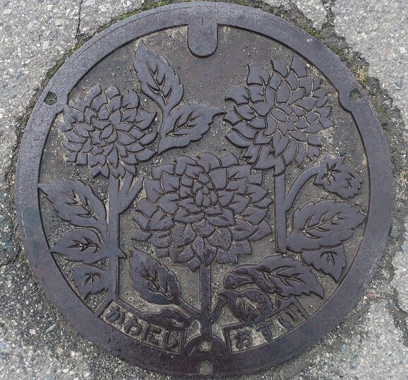 旧朝日村の蓋で村の花片栗がデザインされています。越中山立岩に有りました。