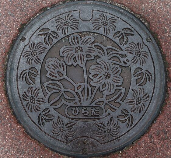 旧平田町の蓋で町の花ミスミソウがデザインされています。飛鳥堂之後83に在る「めんたま畑」の前の歩道に有りました。