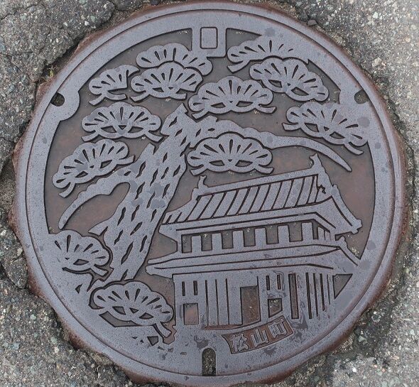 旧松山町の蓋で町の木赤松と松山城址の大手門がデザインされています。仲町41に有りました。