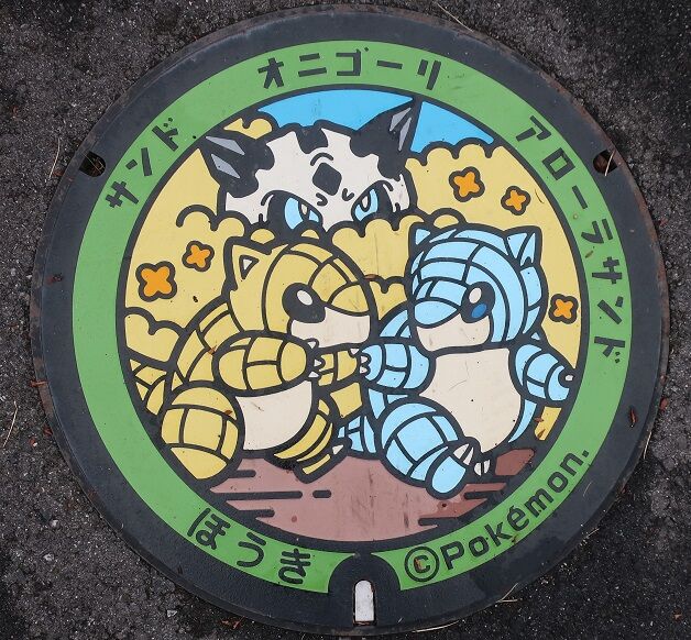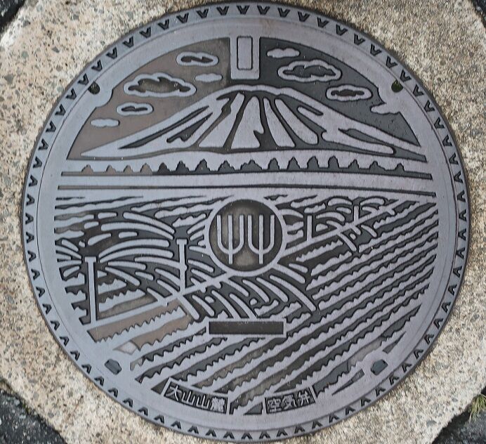 伯耆町のマンホールの蓋 2022年04月07日 今回は伯耆町の蓋を紹介します。ポケふたです。旧岸本町の蓋で町の花菊と大山、特産品のスイカ、町で発掘された「石製鴟尾(せきせいしび)」がデザインされています。「鴟尾」は古代の瓦葺の宮殿や仏殿の屋根の飾りだそうで、瓦質製の物が多く石製の物は珍しいそうです。久古1526に在る「カエル工房」の近くに有りました。大山山麓地区土地改良区の蓋で農林水産省のマークと大山、畑にスプリンクラーで散水している様子がデザインされています。真野のR52上に有りました。旧溝口町の蓋で町の花躑躅と町のマスコットキャラクターの鬼がデザインされています。JR伯備線溝口駅の近くに有りました。続きます。 タグ :##岸本町のマンホール##溝口町のマンホール##伯耆町のマンホール##鳥取県のマンホール##石製鴟尾##鴟尾##北条町のポケふた