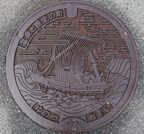 「北前船」がデザインされています。「北前船」では「石見銀山」で採れた銀や木材、「温泉津焼」を運んだそうです。JR山陰本線温泉津駅前の路上に有りました。