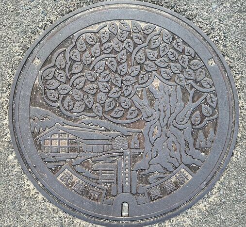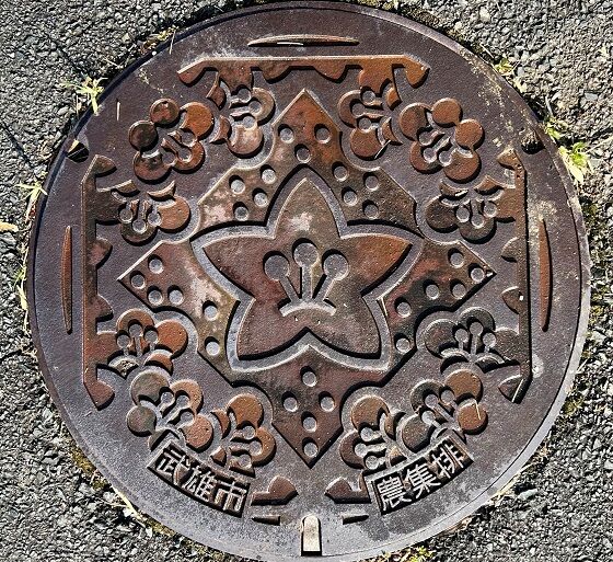 旧市の蓋で市の花桜がデザインされています。西川澄町に在る「矢筈地区農業集落排水処理センター」への入口の路上に有りました。