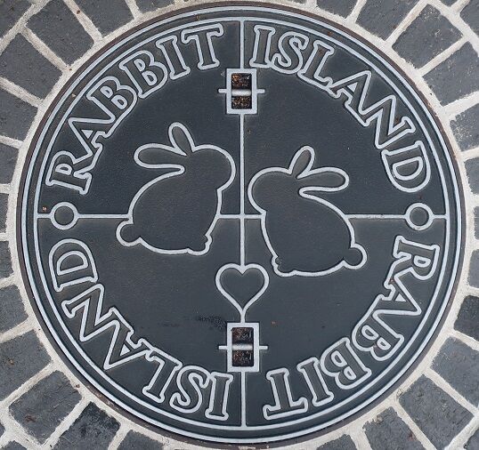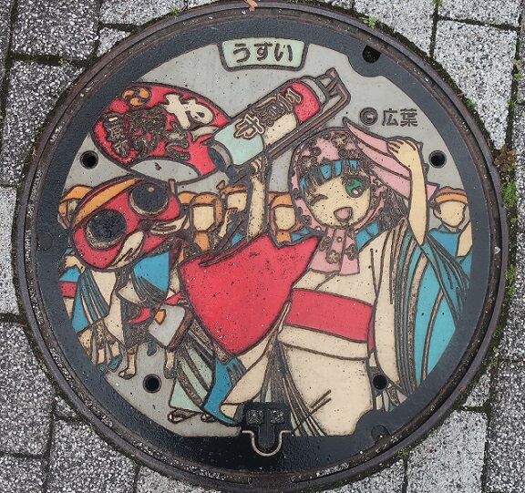 旧甲奴町の蓋で町の花紅梅と町の象徴の鳩がデザインされています。「甲奴コミュニティセンター」の前の路上に有りました。