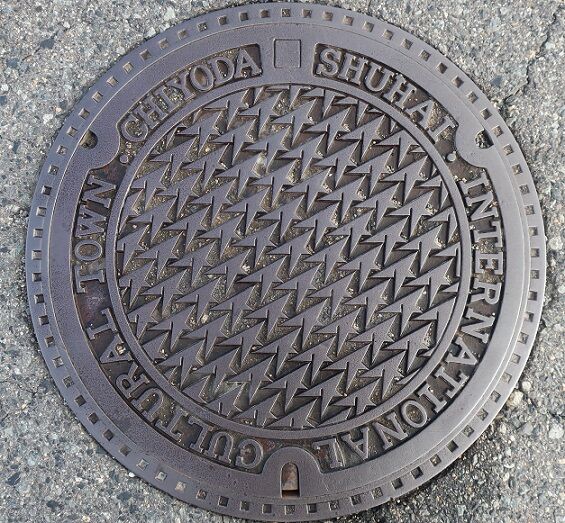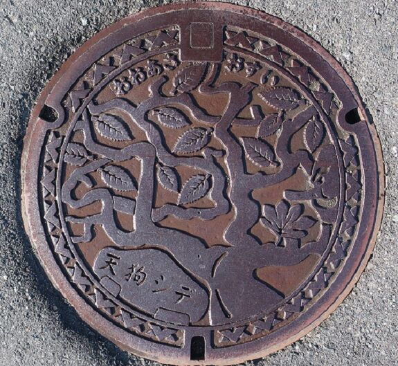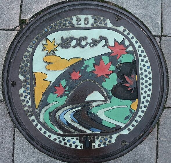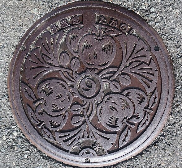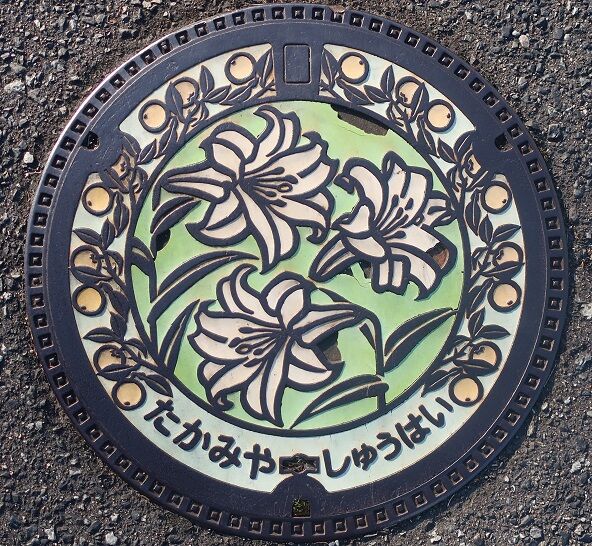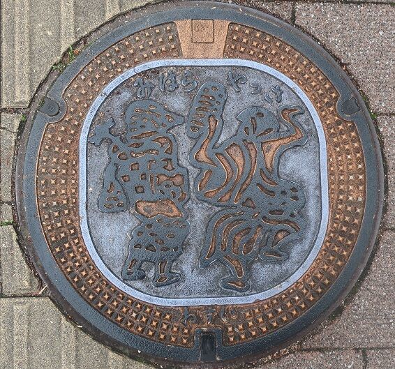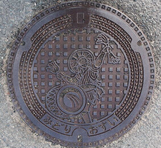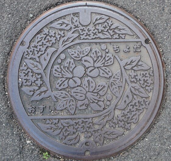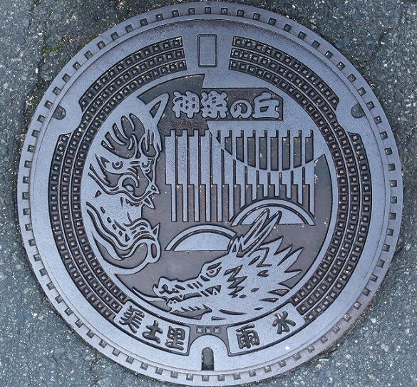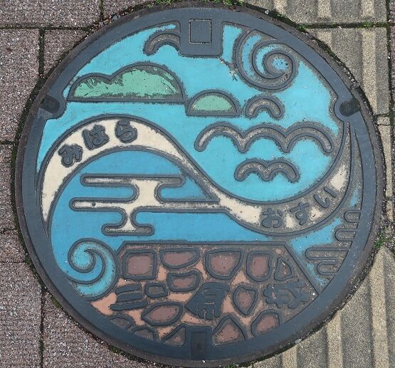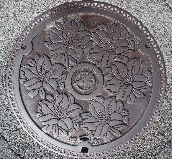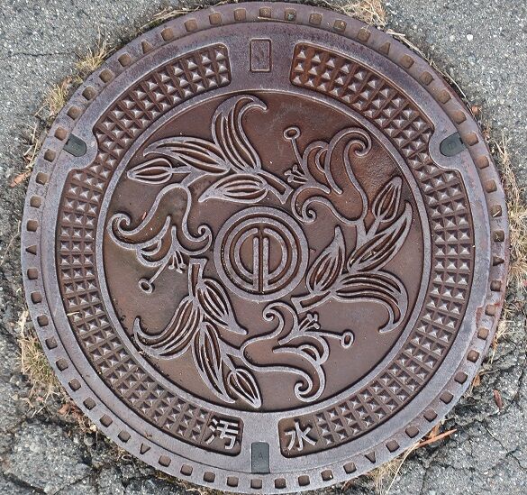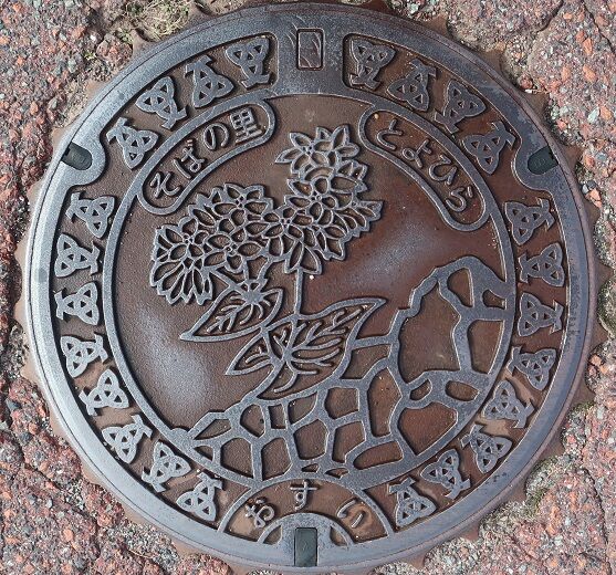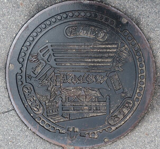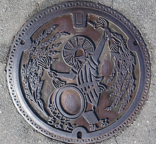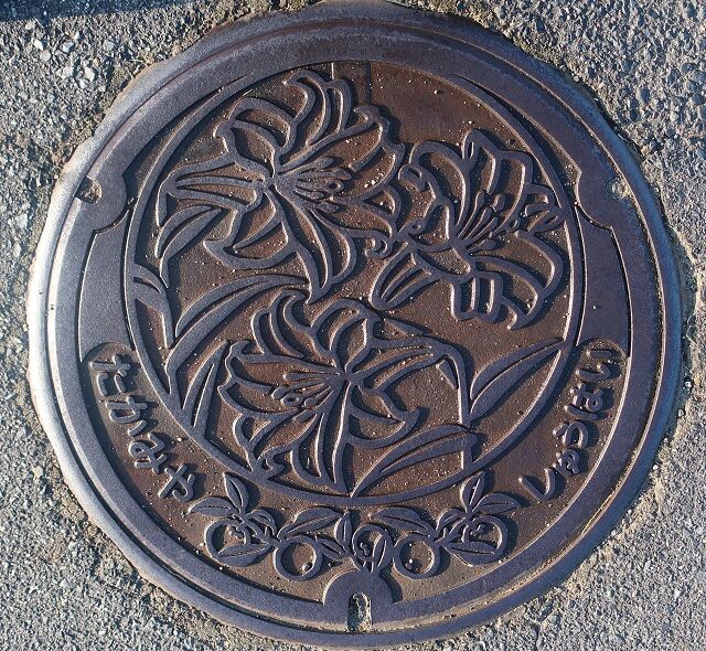 旧三和町の蓋で町の花梅と町の木赤松、ミミズクの町のキャラクターがデザインされています。三和町敷名1569辺りの路上に有りました。