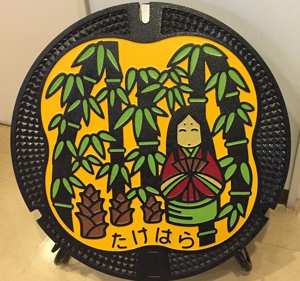 次の6枚の蓋と共に旧布野村の蓋で村の花コブシと村の木欅、村の鳥鶯、稲穂と荷車がデザインされています。次の蓋と共に布野町上布野1329辺りの路上に有りました。